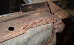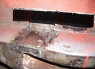 No i odbudowa tych miejsc. Przy okazji kawałek wzmocnienia poprzecznego z tyłu musiał być wymieniony bo po przejechaniu szczotą na boschu zrobiło się sito. Czerwona linia pod progiem wewnętrznym to linia cięcia. Rant podłogi na całej długości będzie nowy. Czuję, ze tak powinno być. Chwilę też zeszło, żeby dobrze siadła tylna część progu wewn. na rancie podłogi i fragmencie nadkola. Potem wyciąłem sobie dla wygody i ochłody dziurę pod nogami pasażera. Ostatnia fotka to tak dla nakreślenia co ma być odbudowane.