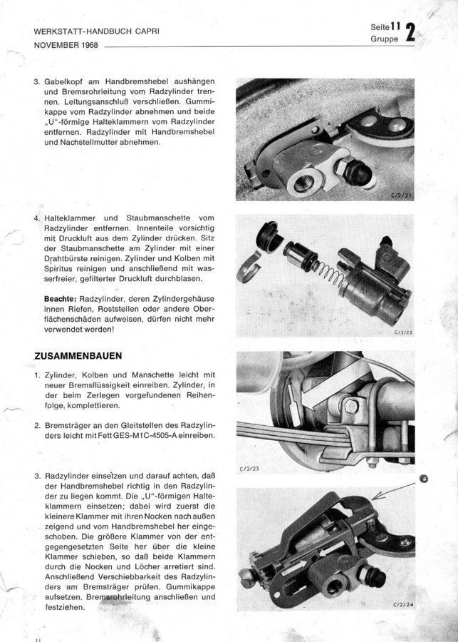 Strona z książki "Ford Capri Werkstatt Handbuch 11.1968" - rozdział 2 - hamulce
