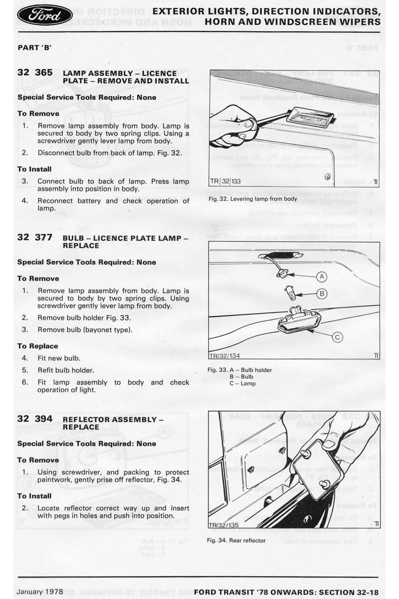 Strona z książki "Ford Transit '78 workshop manual" - 32 - oświetlenie zewnętrzne, kierunkowskazy, klakson, wycieraczki