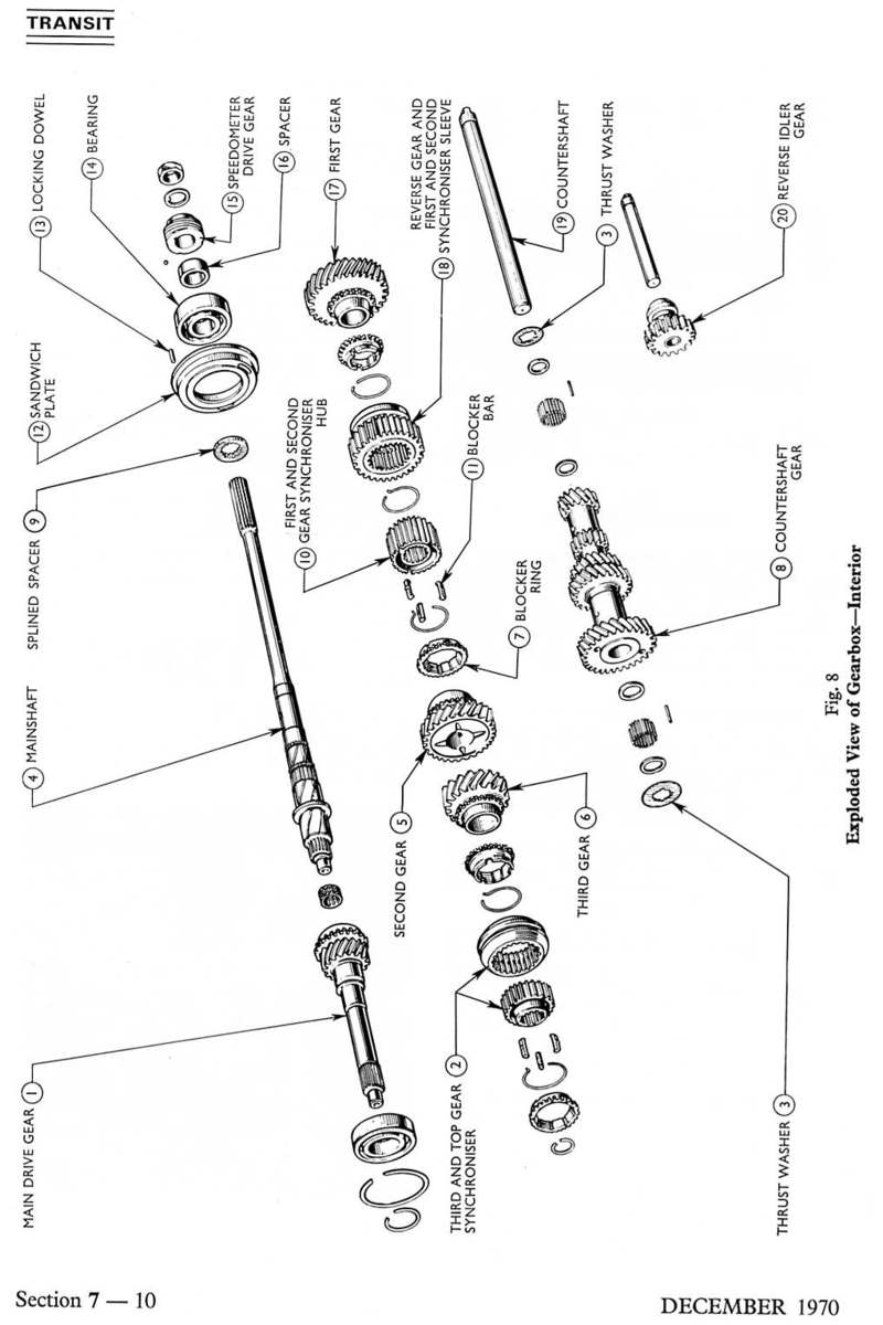 Strona z książki "Ford Transit Mk1 Workshop Manual" - 7 - skrzynia biegów i sprzęgło